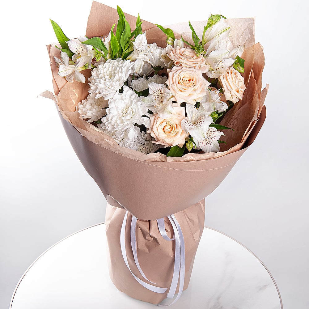 A vibrant floral arrangement in a woven basket, featuring lush red roses, peony roses, multicolored carnations, and eucalyptus cinerea. Delicate asparagus umbellatus adds airiness, while elegant wrapping and a satin ribbon complete this stunning bouquet. A perfect gift for expressing warmth and passion.