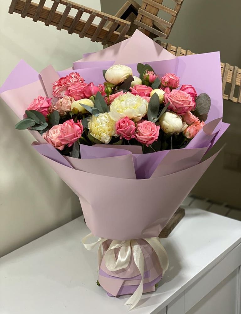 Assembled bouquet with fragrant peonies