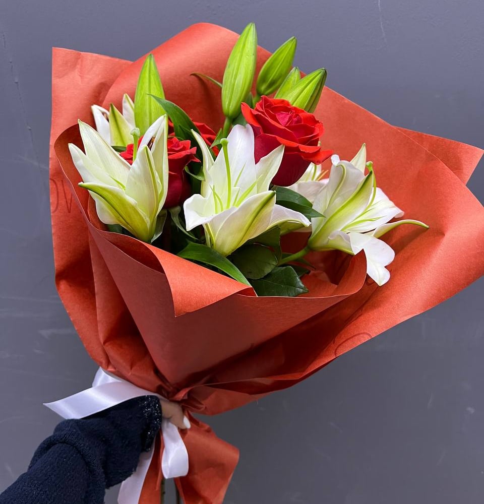 Bouquet of roses with a lily