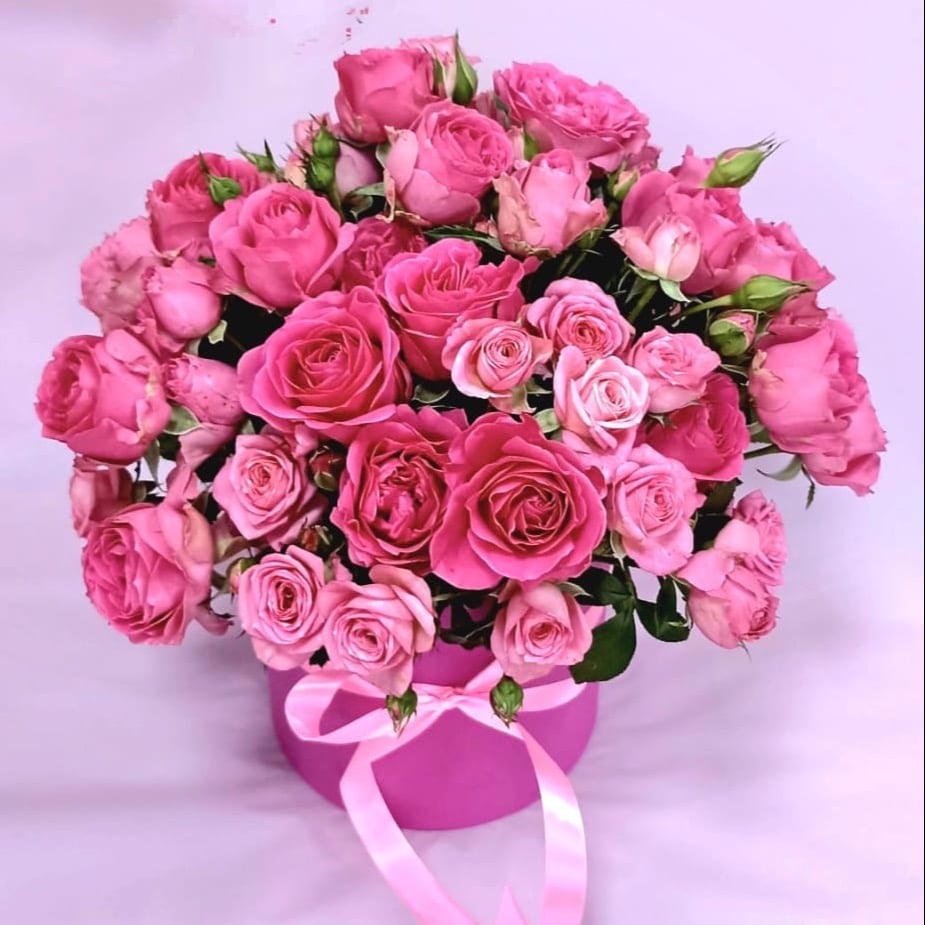 Bouquet of spray roses in a hat box
