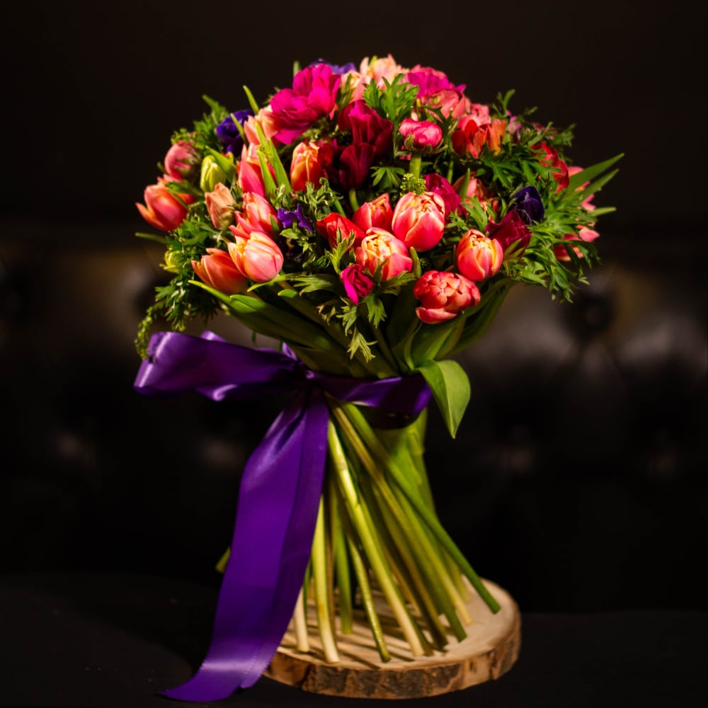 Elegant bouquet of tulips, anemones, and ranunculus for all occasions.