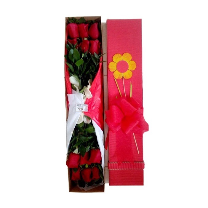 Box of 24 roses in the color of your choice with foliage, decorated with paper, ribbon, and card