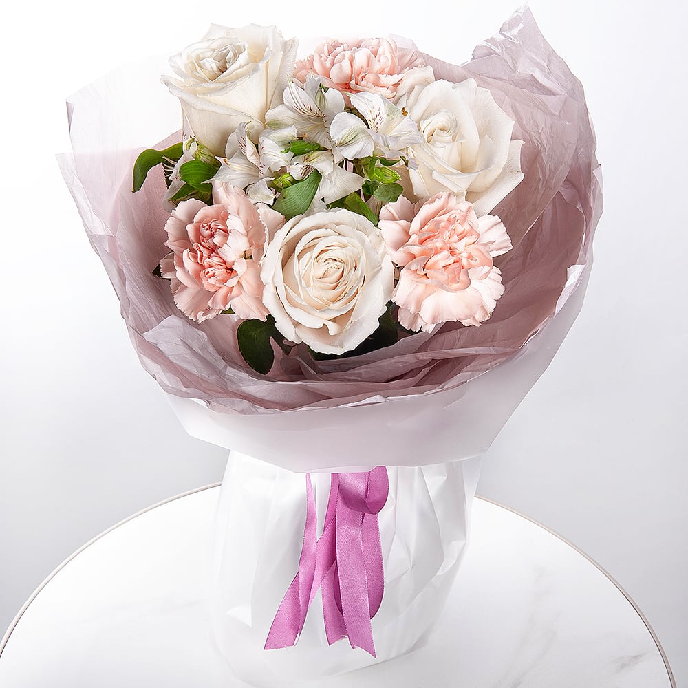 A gentle and sophisticated bouquet featuring pure white roses, multicolored carnations, and soft alstroemeria. Wrapped in elegant pastel-toned packaging and finished with a satin ribbon, this arrangement is perfect for those who appreciate subtle beauty and grace.