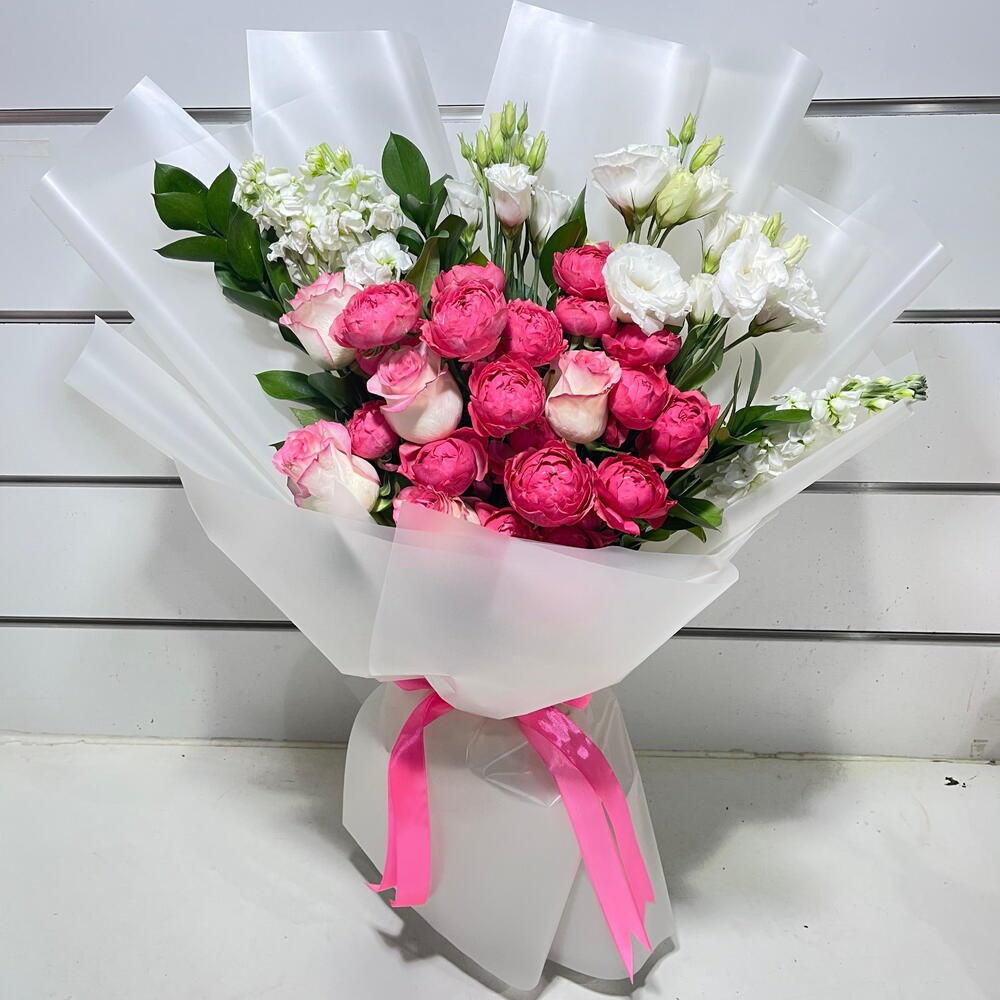 lisanthus - 3 pcs garden spray roses - 4 pcs double shade pink roses - 5 pcs metholi - 3 pcs