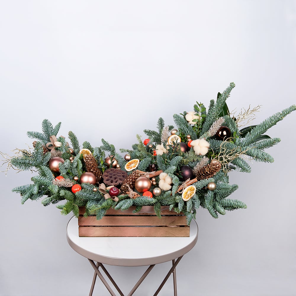 Warm tones of pinecones, dried oranges, and bright holiday ornaments create a cozy atmosphere. This arrangement in a decorative wooden planter evokes the charm of winter evenings by the fireplace and is perfect for festive decor or as a gift for loved ones.