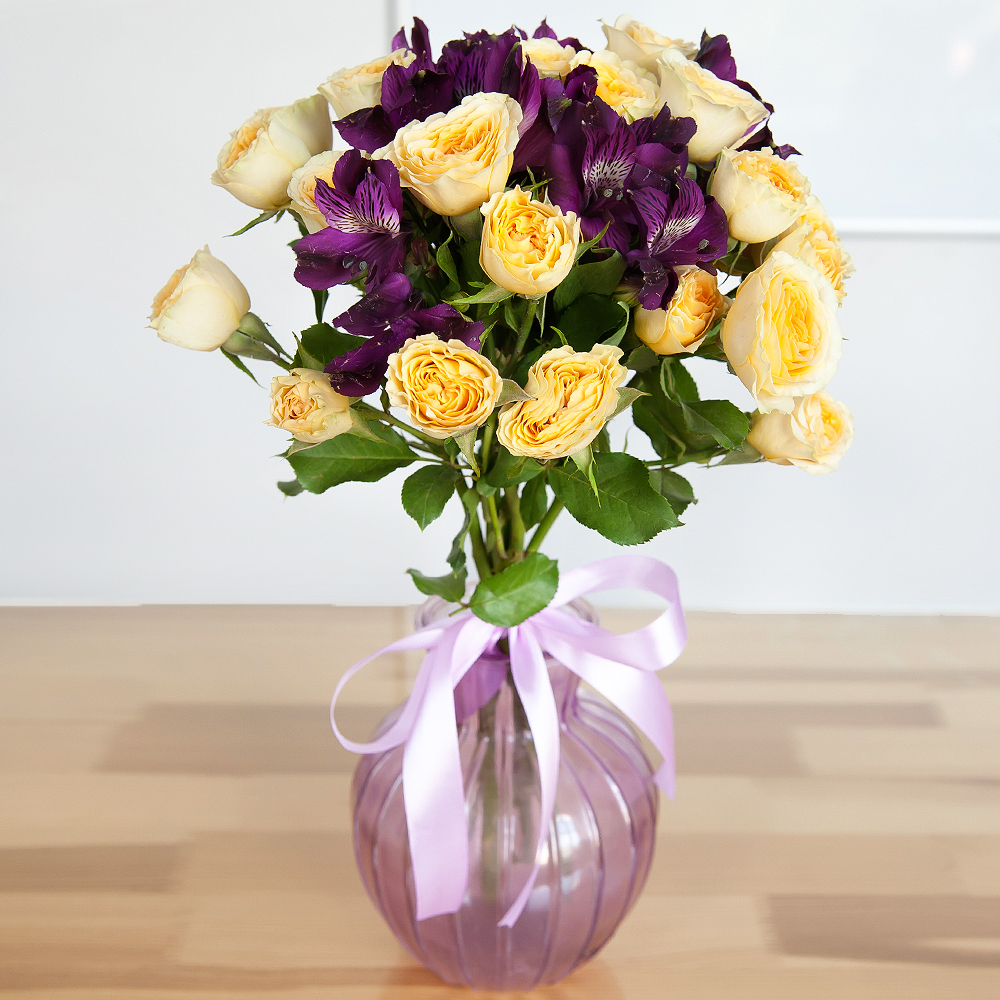 A fragrant bouquet of creamy yellow spray roses and indigo alstroemerias will delight even the most sophisticated flower expert.