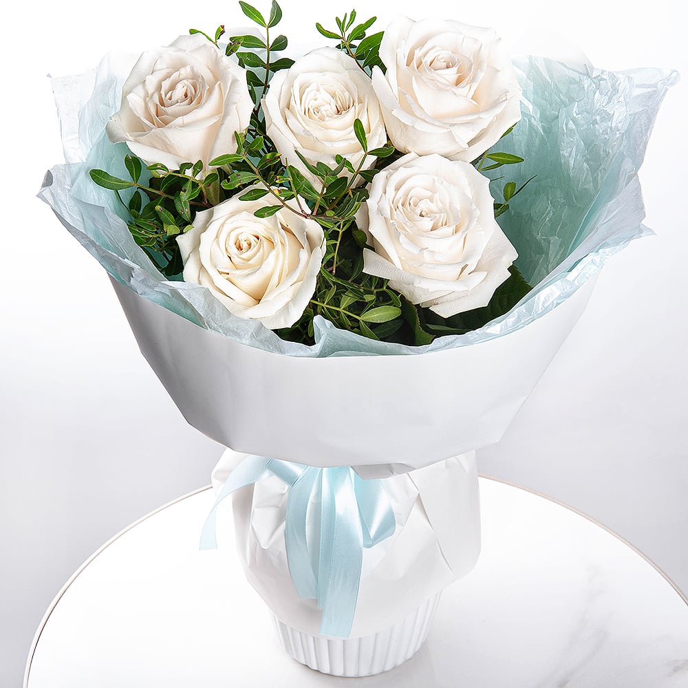 Snowy white roses paired with fresh pistachio leaves create an arrangement that radiates purity and grace. The delicate contrast is complemented by elegant wrapping and a soft satin ribbon, making this bouquet an exquisite gift for any occasion.