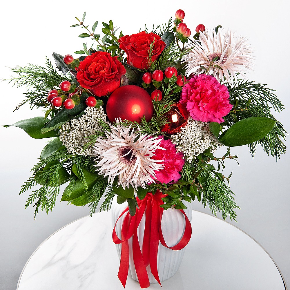 A unique composition of luxurious roses, gerberas, ozothamnus, carnations, ruscus, pistachio, hypericum, and thuja, specially created for a festive mood. This bright and stylish composition will be a wonderful decoration for your home or office, adding warmth and comfort to the atmosphere and creating a feeling of a real New Year's carnival.