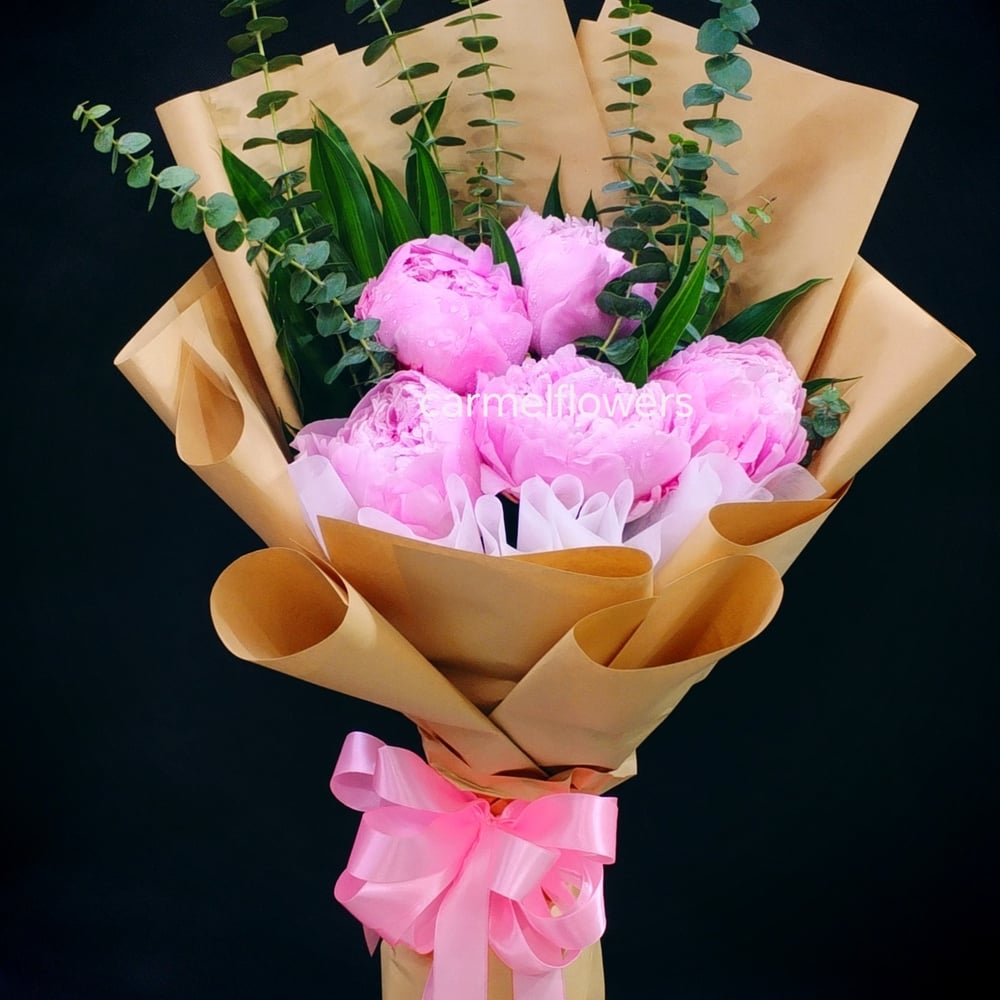 A timeless and elegant arrangement, the Blush Serenity bouquet features five lush peonies in full bloom, radiating soft beauty and romance. Complemented by fresh eucalyptus, its delicate fragrance and flowing greenery add a touch of serenity and tranquillity to any space. Perfect for weddings, anniversaries, or as a heartfelt gift, this bouquet brings a sense of grace and tranquillity to any space.