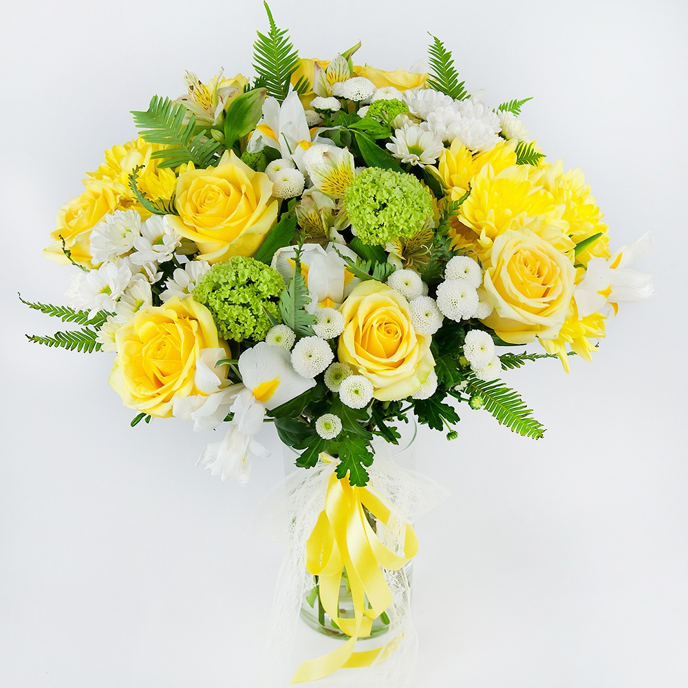 The bouquet "Pleasant Memories" is a harmonious combination of bright colors and soft shades that will give the recipient unforgettable emotions and pleasant memories. Irises symbolize wisdom and tranquility, bush chrysanthemums - longevity and happiness, yellow roses - joy and friendship, viburnum - beauty and elegance, alstroemerias - lightness and airiness, and umbrella adds sophistication and refinement to the bouquet. This bouquet will make a wonderful gift for any occasion - whether it's a birthday, anniversary, wedding, or just a desire to please a loved one. It will give a feeling of warmth, love, and care. The "Pleasant Memories" bouquet is created by experienced florists using only fresh flowers. It will delight the recipient with its beauty and fragrance for several days.