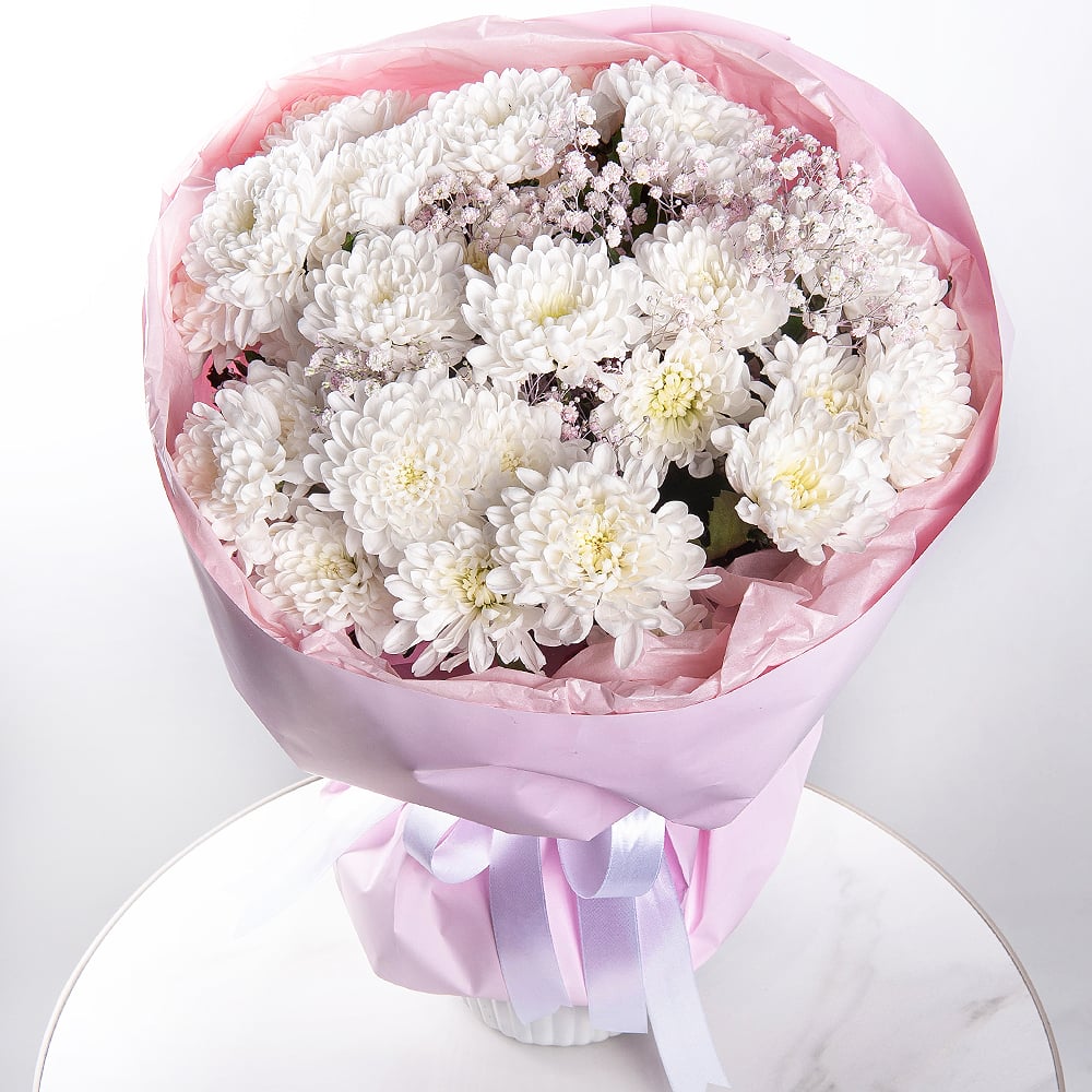 A graceful bouquet combining multicolored carnations, baby’s breath, and spray chrysanthemums. Wrapped in stylish packaging and finished with a satin ribbon, it embodies lightness and joy.