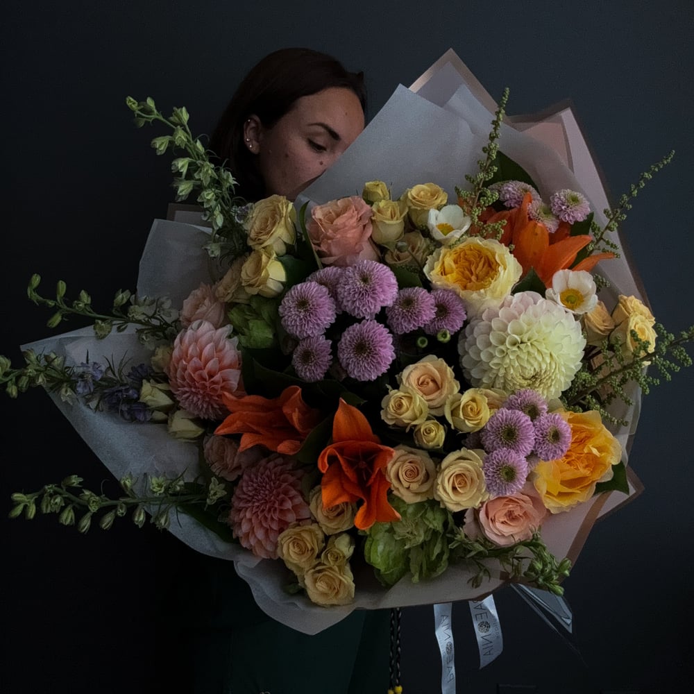 A beautiful bouquet featuring roses, spray roses, limonium, peony spray roses, and lisianthus. Size is Large, standing at 50cm tall. Note: We work with fresh seasonal flowers, so the bouquet composition may vary slightly. Even if a particular flower isn't available, we aim to create a similar arrangement. If there's a specific flower that's important to you, please contact us, and we'll discuss the best options.