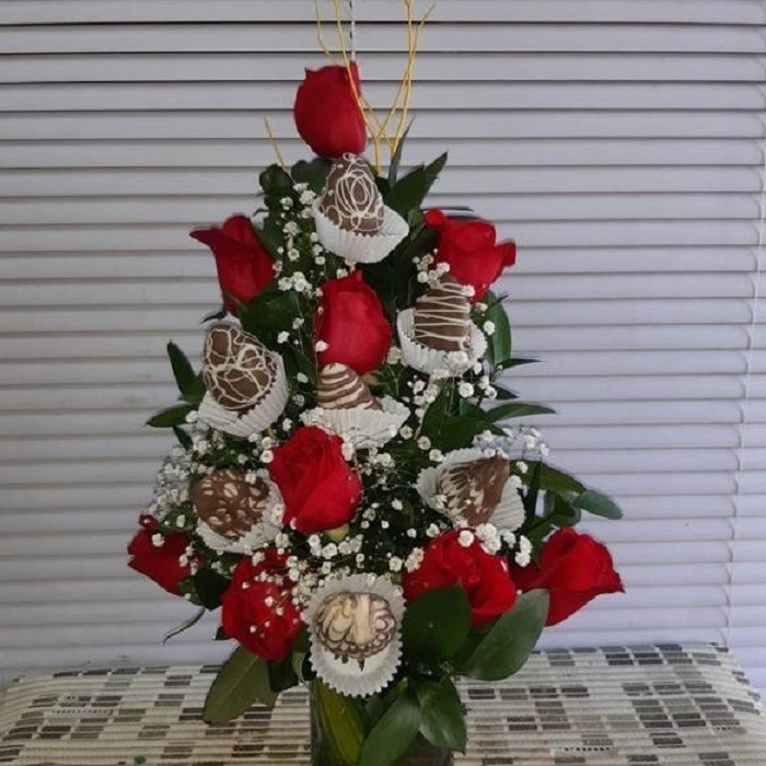 Strawberry arrangement with chocolate and roses