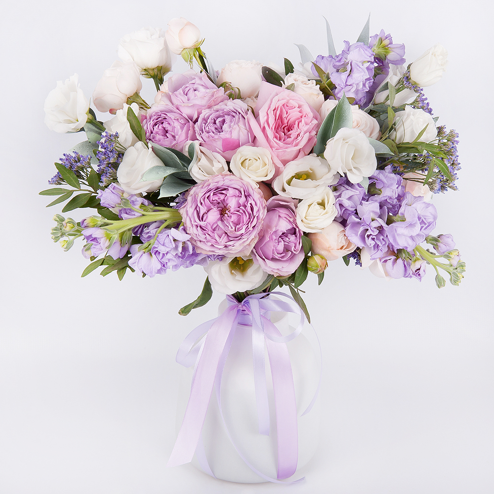 The "Happy Bride" bouquet is the embodiment of tenderness and beauty, created from spray roses, lisianthus, peony-like spray roses, stock flowers, pistachios, limonium, and ruscus. The "Happy Bride" bouquet is crafted by experienced florists using only fresh flowers. It will delight the recipient with its beauty and fragrance for several days. The "Happy Bride" bouquet will make a wonderful gift for a wedding, anniversary, or celebration, and can also be used as a token of appreciation or gratitude. This bouquet is not only beautiful but also unique. It combines different shades and shapes, creating a one-of-a-kind composition.