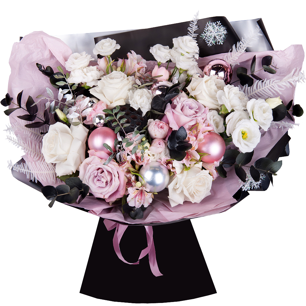 The "Nutcracker" bouquet is a luxurious combination of pink and white roses, peony-like bush roses, alstroemerias, carnations, lisianthus, and other decorative elements. In this bouquet, each flower harmoniously complements each other, creating a unique atmosphere of celebration and magic.