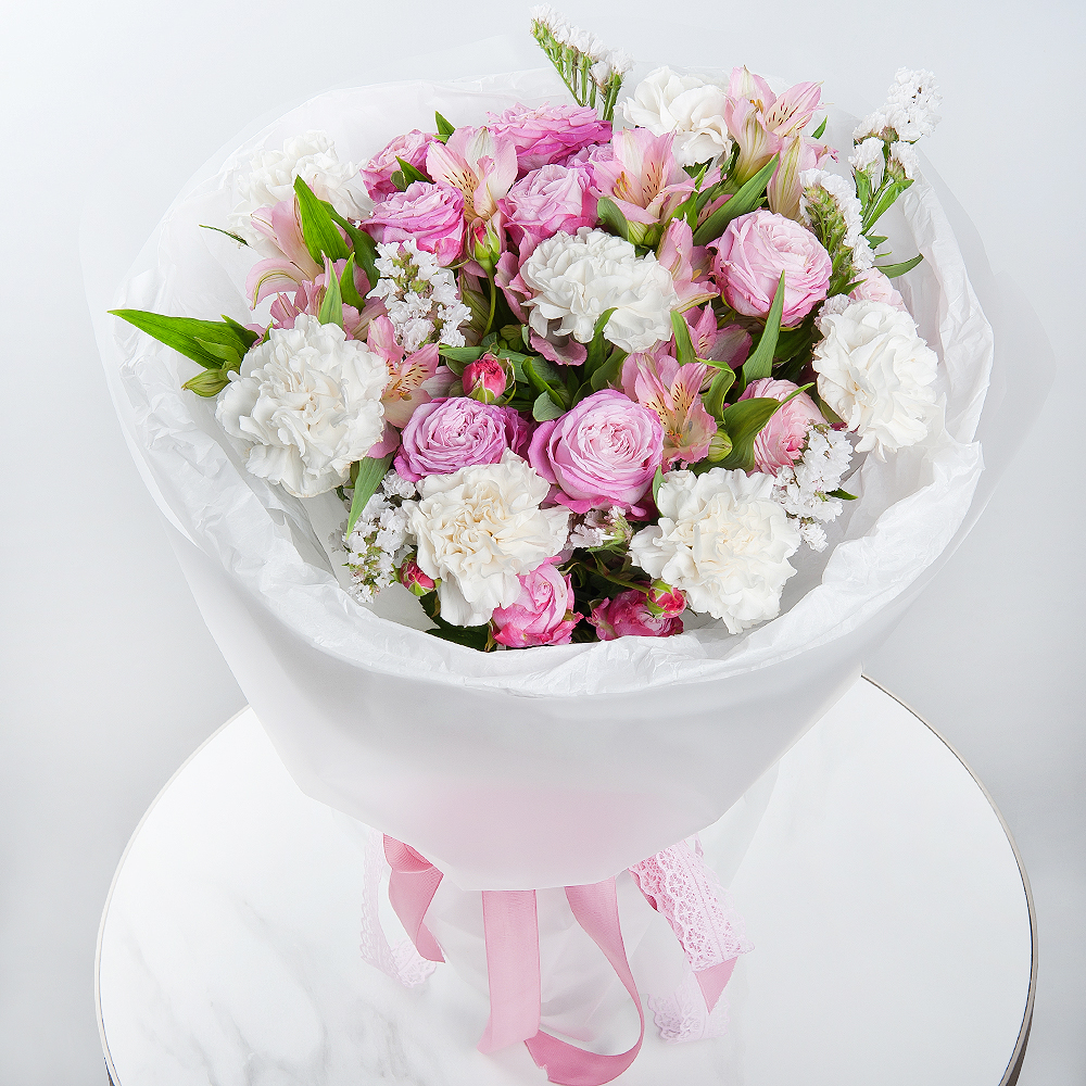 This bouquet, like a whirlwind of emotions, combines peony-like bush roses, carnations, alstroemerias, and statice. Modern packaging emphasizes the variability and brightness of the composition. The bouquet will be the perfect gift for expressing the strongest feelings and emotions.